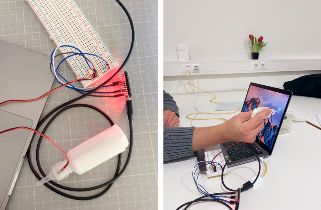 The second version prototype utilizes Node.js to create a virtual operating environment for the computer. When the user presses the end of the datapette where the pressure sensor is located, the light emitted by the LED light chain will flow from the top to the end of the datapette and stay there, indicating that the file has been stored in the datapette. When the user expels the file, the light will flow out of the datapette in the opposite direction. Additionally, a display screen and buttons are connected to select the files to be expelled.