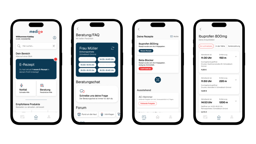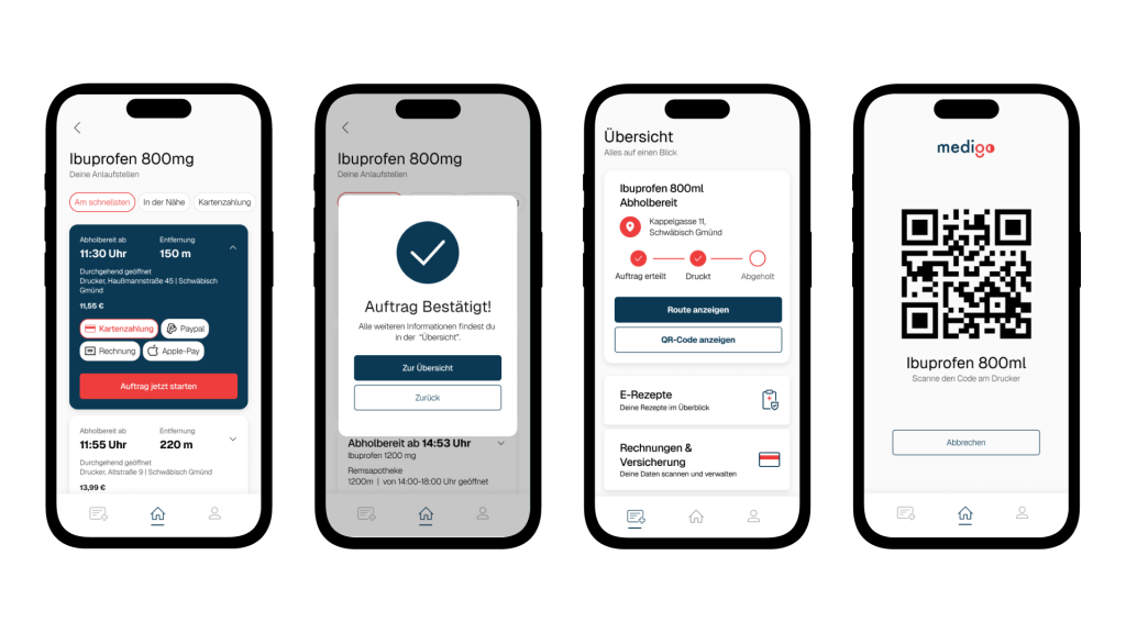 I can redeem it directly in the app and choose either a local pharmacy, drugstore, or even a 3D printer for pickup. After paying through the app, I simply show a QR code to collect my medication. In our concept, we chose a 3D printer to allow flexible, self-selected pickup times—eliminating dependence on store hours and offering maximum convenience. The emergency use case is illustrated in the video below.